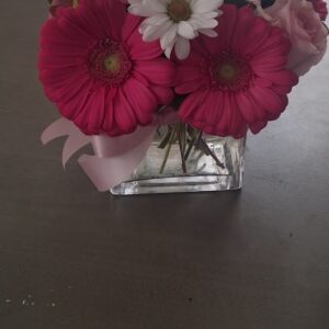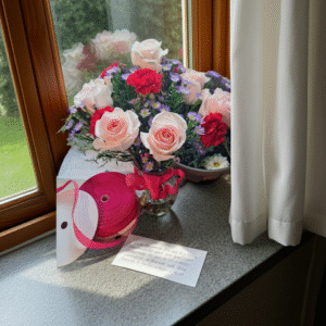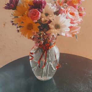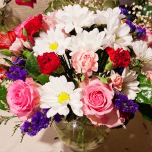 - Infused with warmth and grace, this romantic bouquet blends delicate pink roses, vibrant red carnations, and whimsical purple filler blooms—each chosen for its texture and tone. Presented in a crystal-clear glass vase, the arrangement rests beside a spool of blush ribbon and a handwritten note, evoking the intimacy of a personal gesture. Ideal for expressing gratitude, love, or quiet celebration,…