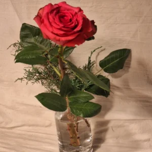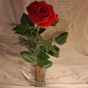- A striking red rose softened by airy waxflower, arranged in glass for quiet moments of love, thanks, or reflection This piece complements our “Single Stem Flowers” and “Just Because” collections, and is often chosen for intimate gestures, bedside gifts, or moments of quiet celebration.